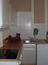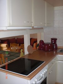 - Herd, Backofen, Kühlschrank mit Tiefkühlfach, Kaffeemaschine, Toaster, Wasserkocher